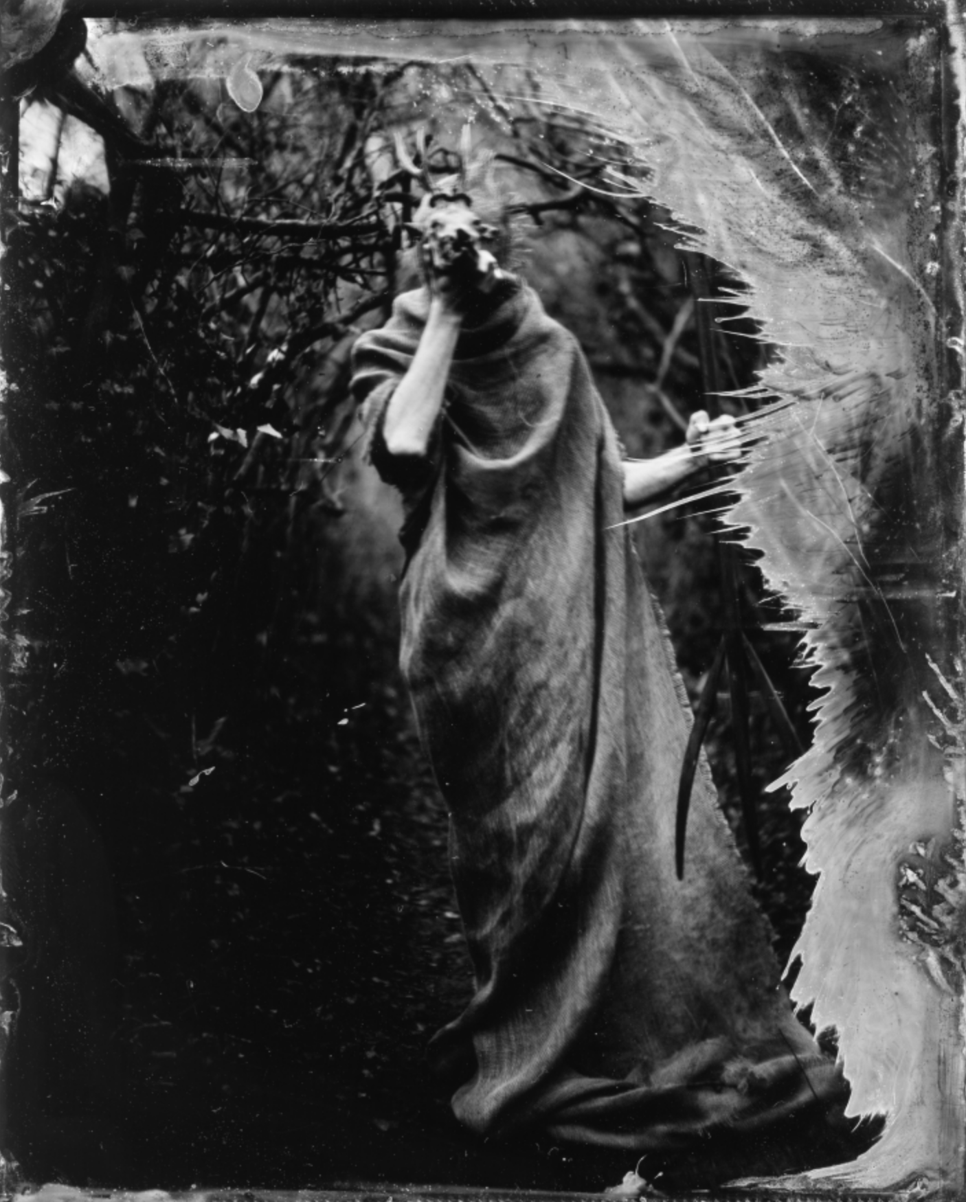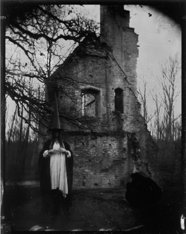 Wet plate folklore is an ongoing project of Veera Kaamos Pitkänen and Robert Alexander. The artists are creating a substantial series of analogue photographs inspired by the rich folklore of the British Isles. The imagery draws on existing myths, legends and influences from classic folk horror films, mixing these with freshly imagined characters inspired by landscapes the duo is working in. Additionally, Pitkänen and Alexander photograph standing stones and other sacred and significant sites across the UK.